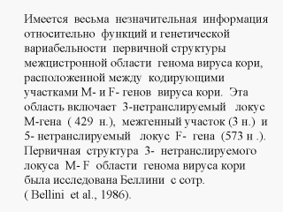 | Было высказано предположение , что 3-нетранслируемый локус М-гена может обладать уникальной вторичной структурой , которая обеспечивает стабильность m РНК , кодирующей матриксный белок. |