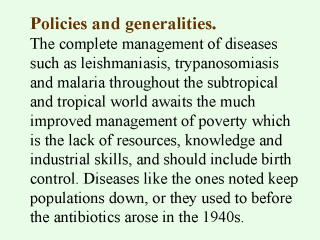 | Poverty is often associated with rural life, and many or even most of the vector-borne diseases are rural. The urban-rural interfac changes via population expansion that includes continuous immigration to the cities. Eradication of leishmaniasis depends upon the eventual eradication of the diverse sandfly vectors, not upon individual treatments. The ultimate goal is better living, and less disease is part of this. |