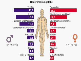 Anteile der häufigsten Krebsformen an der Gesamtzahl 1998 in Deutschland Quelle: AG Bevölkerungsbezogener Krebsregister in Deutschland. Krebs in Deutschland. 3. Ausgabe, Saarbrücken, 2002, S. 9 |