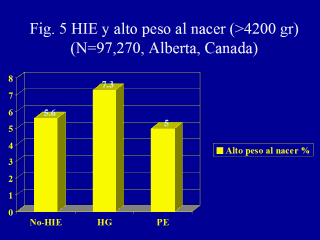 | Esta figura muestra que la incidencia de alto peso al nacer es más alta entre mujeres con HG que en mujeres sin HIE. No hay diferencias significativas en la incidencia de alto peso al nacer en PE y sin HIE. |