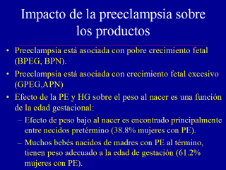 Encontramos que el efecto de peso bajo al nacer se observa en nacidos pretérmino. Muchos bebés nacidos de madres con PE, tienen peso adecuado para la edad gestacional.