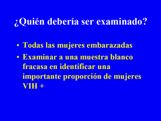 | Estudios cohorte y casos controles, han mostrado que examinando a un grupo blanco de embarazadas con factores de riesgo, sólo se identifican 8-58% que sean VIH + |