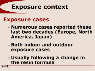 references: - Severe acute respiratory illness linked to use of shoe sprays (1993) Colorado, November 1993. MMWR Morb. Mortal. Wkly Rep 42: 885-887. - Tanino M, Kamishima K, Miyamoto H, Miyamoto K, Kawakami Y (1999) Acute respiratory failure caused by inhalation of waterproofing spray fumes. Nihon Kokyuki Gakkai Zasshi 37: 983-986. - Testud F, Gabrielle L, Paquin ML, Descotes J (1998) Alvéolite aiguë après utilisation d’un aérosol imperméabilisant : à propos de deux observations. Rev Med Interne 19: 262-264. - Wiessmann KJ (1982) Atemnotsyndrom durch Aerosole oberflächenaktiver fluororganischer Verbindungen. Dtsch Med Wochenschr 107: 683-684. These cases are often linked to a change in the resin formula. Two mechanisms are suspected (1) specific tocicity of the new polymer (2) increase of respirable particle related to the change of its physico-chemical properties. |
