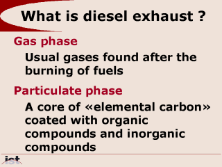 Diesel exhaust is composed of different gases such as NO2, CO, CO2 and SO2 (depending on the sulfur content of the fuel) and of particulates which are describes as a core of carbon (elemental carbon) coated with adsorbed organic compounds such as polycyclic aromatic hydrocarbons and some derivatives (such as nitro compounds) as well as other chemicals such as metals and inorganic compounds. |