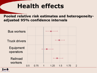 A summary of a few relevant epidemiologic studies shows that the truck drivers and the railroad workers are apparently at most risk of lung cancer. Underground workers are also at higher risk but are exposed not only to diesel exhaust but usually to a lot of other nuisances (dust and gases). It should be stressed that the epidemiologic studies related to diesel exhaust are challenged by a few authors who believe that the higher odd ratio for lung cancer may be due to other causes than diesel exhaust particulates. Reference : Bhatia et al. Epidemiology 1998, 9; 84-91 |