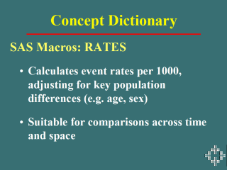 Health Authorities. The RATES macro is designed to calculate the rate of events per 1,000 in distinct sub-populations and adjusts for differences in those sub-populations. RATES reads both population files (the counts of individuals in a particular group or area) and data files. In addition to geographical comparisons, it can be used to compare area rates between two time periods (using the T2 statistic).13 |
