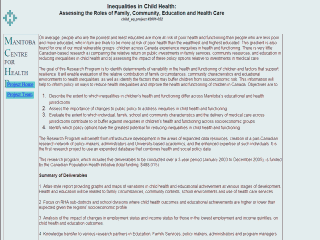 between MCHP and other sites. The external website for this project currently consists of two pages: the index page (shown on slide) and the project team page. The index (or home) page presents the project overview: the study goals and objectives, the duration of project, and the funding received. The project team page provides contact information for all members of the project team, including (where available) links to member websites containing that information. This page also notes when project team members signed the MCHP confidentiality agreement to permit data access. The internal website includes a great deal more information, with links to database information pages, a methods section, pages regarding analysis organized by database, and a project management section describing timelines and project responsibilities. |