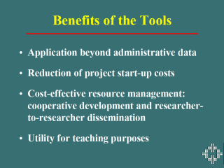 models based on secondary analyses of surveys are becoming more popular.27, 28 MCHP has used two full-time equivalent staff members over several years to establish and maintain these tools. This investment translates into greatly reduced maintenance costs and startup time associated with new research projects. Cooperation among researchers and programmers has been facilitated by the ongoing usefulness of these tools in enhancing productivity. The pressure for producing timely deliverables and the opportunities for investigator-initiated reseach have heightened the need for management; these tools are critical to such efforts. The modular design has served to efficiently relay information between analysts and researchers. The timeliness of the resource has also proven to be invaluable for teaching materials - within the centre, the university and in the Epidemiology Supercourse.29 |