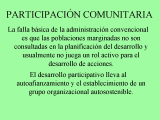 La falla básica de la administración convencional es que las poblaciones marginadas no son consultadas en la planificación del desarrollo y usualmente no juega un rol activo para el desarrollo de acciones. Esto es debido a que la gran mayoría de estas poblaciones no presentan estructuras organizacionales que representen sus intereses.