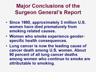 reproductive outcomes. Exposure to environmental tobacco smoke is a cause of lung cancer and coronary heart disease among women who are lifetime nonsmokers. Infants born to women exposed to environmental tobacco smoke during pregnancy have a small decrement in birth weight and a slightly increased risk of intrauterine growth retardation compared to infants of nonexposed women. Lung cancer is now the leading cause of cancer death among U.S. women; it surpassed breast cancer in 1987. About 90 percent of all lung cancer deaths among women who continue to smoke are attributable to smoking. |