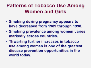 percent to as high as 22 percent. Since the late 1970s or early 1980s, women are just as likely to attempt to quit and succeed as are men. Smoking prevalence among women varies markedly across countries; it is as low as an estimated 7 percent in developing countries to 24 percent in developed countries. |