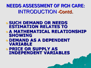 | IN GENERAL CONCEPT OF NEEDS ASSESSMENT APPEARS TO RESSEMBLE ESTIMATION OF DEMANDS FOR CERTAIN GOODS OR SERVICES. IN ECONOMIC TERMS DEMANDS OF CERTAIN GOODS OR SERVICES ARE LINKED WITH PRICE OR COST OR SUPPLY OF THAT GOODS OR SERVICES. DEMAND ESTIMATION IN THIS ECONOMIC SENSE IS A DEPENDENT VARIABLE AND PRICE, ETC ARE INDEPENDENT OR EXPLANATORY VARIABLES. |