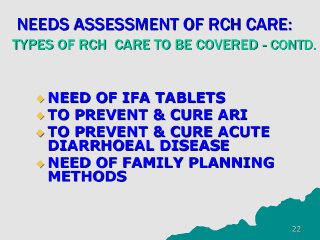 RESPIRATORY INFECTION. IN RESPECT OF THESE ITEMS POSSIBLE NUMBER OF PREGNANT WOMEN FOR EFA TABLETS, POSSIBLE NO. OF INFANTS WHO MAY NEED MEDICINES FOR ARI , DIARRHOEA ARE TO BE ESTIMATED. REGARDING fp MATHOS, NO. OF WOMEN TO BE STREILIZED, TO BE INSERTED WITH IUD, NO. OF WOMEN WHO WILL CONSUME ORAL PILLS, AND NO. OF MEN WHO WILL NEED CONDOMS FOR FAMILY PLANNING WILL BE ESTIMATED. |