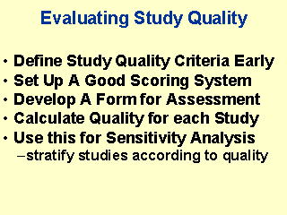 | Decide which studies you want to include based on the quality of the research reported in them. Decide the study quality standards early on, preferably before beginning the analysis. A standardized form helps a lot. Give a score to each study and analyze the studies based on the quality scores of the studies. |