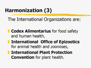 These organizations are: (a) Codex Alimentarius for for food safety and human health. The standards, guidelines and recommendations established by the Codex Alimentarius Commission concern food additives, veterinary drug and pesticide residues, contaminants, methods of analysis and sampling, and codes and guidelines of hygienic practice; (b)International Office of Epizootics for animal health and zoonoses, (c)International Plant Protection Convention for plant health, (d) for matters not covered by the above organizations, appropriate standards, guidelines and recommendations are promulgated by other relevant international organizations as identified by the SPS Committee. |