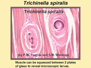 perhaps 3 mm long and males half that size. Animals are infected with T. spiralis