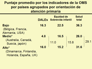 Para indicadores usados por la Organizaci ón Mundial de la Salud, países con pobre atención primaria, son peores. Esto es especialmente verdad para la sobrevida del niño (hasta la edad de 2), para los cuales los países con peores atención primaria tiene peores promedios y los países con mejores atención primaria, tienen los mejores.Fuente: World Health Organization. The World Health Report 2000. Health Systems: Improving Performance. Geneva: World Health Organization, 2000. |