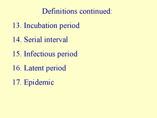 14. Serial interval: time between generations of disease (also called generation time). Time between similar symptoms in successive generations. 15. Infectious period: length of time a person can transmit disease. 16. Latent period: period of infection without being infectious. This may occur right after exposure or late in the disease. 17. Epidemic: occurrence of cases of illness in excess of expectancy. An epidemic whose incidence remains stable for a long period is describes as endemic. A global outbreak is described as a pandemic. |