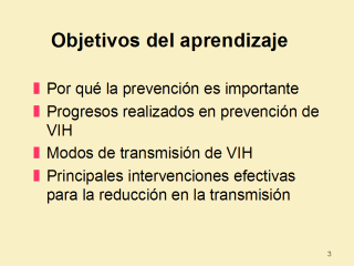 | Los objetivos de aprendizaje de esta presentación son: adquirir el conocimiento de por qué la prevención es importante, los progresos realizados en la prevención de VIH, los modos de transmisión de VIH y las principales intervenciones efectivas en la reducción de la transmisión |
