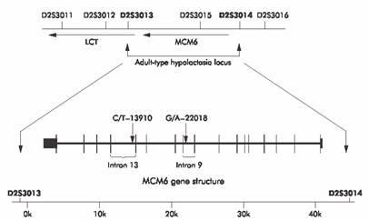 Schematic representation of the region between the two highlighted genetic markers that is associated with adult-type hypolactasia (Enattah and colleagues). Vertical bars within the MCM6 gene represent the exons, the widths indicating relative size. The two associated single base polymorphisms (SNPs) lie within the indicated introns of the MCM6 gene which is located 5’ to the LCT (lactase-phlorizin hydrolase) gene on human chromosome 2. The arrows indicate the direction of gene transcription (the centromeric region of the chromosome is located to the left). The scale bar at the bottom of the figure indicates the size of the DNA region occupied by the MCM6 gene. The numbers at introns 13 and 9 indicate the positions of the SNPs relative to the transcriptional start site of lactase (redrawn from Enattah and colleagues20). |