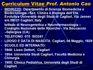 ACCADEMICA E DI RICERCA: CARICHE RICOPERTE: 1973-tutt’oggi Professore Ordinario di Clinica Pediatrica dell’Università Degli Studi di Cagliari 1974-tutt’oggi Direttore Istituto di Clinica e Biologia dell’Età Evolutiva – Università degli Studi di Cagliari 1981-tutt’oggi Primario Ospedale Regionale per le Microcitemie – ASL 8 Cagliari 1982-tutt’oggi Direttore del Centro per il Controllo delle Emoglobinopatie Ereditarie della WHO - Cagliari 1992-tutt’oggi Direttore dell’Istituto di Neurogenetica e Neurofarmacologia – CNR Cagliari 1998-tutt’oggi Direttore della Scuola di Specializzazione in Pediatria - Università Cagliari AREE DI COMPETENZA: Pediatria Ematologia Clinica E Molecolare Genetica Clinica E Molecolare Sindromi Malformative RICONOSCIMENTI E ONORIFICIENZE: 1993: Allan Award, American Society of Human Genetics 1994: Fellow of the American Association for the Advancement of Science 1995: First Internazionale Award “Maria Vilma e Bianca Querci” 2000: Marta Philipson Award 341 PUBBLICAZIONI |