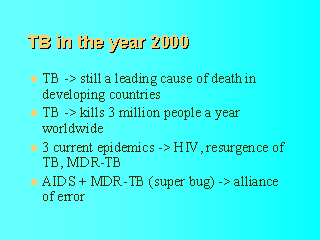 and kills 3 million people a year worldwide. In Western Europe and other industrialized countries where TB has become a rare disease, the declining incidence has been halted or reversed. Between 1985 1991, an 18% increase in TB incidence was reported in the USA, and a doubled incidence of TB in New York city. Contributing factors are: a. influx of immigrants from countries with endemic TB, b. increased number of social outcasts living in crowded places, c. AIDS-epidemic, d. emergence of MDR-TB (19% of new TB cases in New York in 1991), and e. dismantling of TB control programs. |