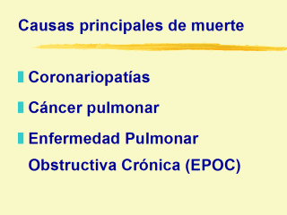 Puede resultar ya sea por tabaquismo y exposición a diversas sustancias químicas o polvos. El riesgo de bronquitis crónica por fumar y por exposición laboral a polvos en la mayor parte de estudios es aditivo, con la mayor parte de casos atribuibles al tabaco. La bronquitis cronica se puede relacionar con reducción del flujo aereo en grandes volúmenes pulmonares, lo cual es consistente con enfermedad grave de vias respiratorias. La enfermedad pulmonar obstructiva crónica (EPOC) es la mas especifica por tabaquismo. La lesion de vias respiratorias pequeñas es comun en fumadores, aun sin síntomas. Las pruebas de funcion pulmonar en estos, por lo comun muestran, reducción del flujo máximo y medio respiratorio, una manifestación de patología de vias respiratorias pequeñas. El enfisema es una etapa mas avanzada de neumopatia crónica relacionada con tabaquismo en la cual la destrucción de paredes alveolares produce obstrucción de aire, aumento de la adaptabilidad y capacidad pulmonar total, asi como disminución de la capacidad de difusión de monóxido de carbono. |