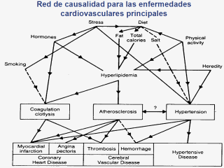 | Red de causalidad para las principales enfermedades cardiovasculares. Fuente: Stallones, R.A. (1966). Prospective epidemiologic studies of cerebrovascular disease. Public Health Monograph No. 76, Washington, DC: U.S. Government Printing Office. p. 53. |