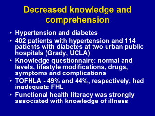 Williams MV, Baker DW, Parker RM, et al. Relationship of functional health literacy to patients’ knowledge of their chronic disease. Arch Intern Med 1998;158:166-172.