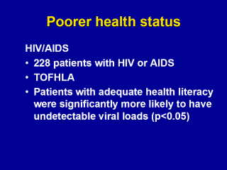 | Kalichman SC, Benotsch E, Suarez T. Health literacy and health-related knowledge among persons living with HIV/AIDS. Am J Prev Med 2000;18:325-331. |