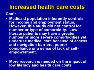 | Weiss BD, Blanchard JS, McGhee DL, et al. Illiteracy among Medicaid recipients and its relationship to health care costs. J Health Care Poor Underserved 1994;5:99-111. |