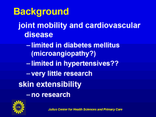 deze parameters en hart- en vaatziekten (bloeddruk) Gewrichtsmobiliteit is vooral bestudeerd in diabetes mellitus. Het gaat dan mn om de mobiliteit van de kleinere gewrichten (hand). In DM is beperkingen van de gewrichtsbeweeglijkheid een veel voorkomende complicatie. Algemeen wordt aangenomen dat microangiopathie een centrale rol speelt. Overigens is Dmbij uitstek een ziekte waarbij vaatwandstijfheid met toegenomen crosslinking zou kunnen samenhangen op basis van een gestoord glucosemetabolisme. Kors vand er Ent heeft gerecent gevonden dat bij jonge kinderen met insuline afhankelijke DM al sprake is van verminderde longfunctie. Dit lijkt veel eerder door een verandering in de crosslinking te kunnen worden verklaard dan door microangiopathie. Er is maar 1 kleine letter in de BMJ in 1986 geweest waarin melding werd gemaakt van beperking van de kleine handgewrichten bij mensen met hypertensie. Die bevinding werd overigens ook in termen van microangiopathie geduid.