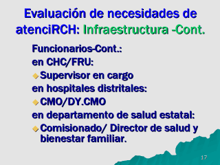 referidos aquí. FRU: Unidad de referencia primaria está teniendo las mismas facilidades como en CHC. Casos complicados son referidos a CHC/FRU. CMO: Jefe oficial médico que está a cargo de un hospital de distrito haciéndose cargo del sistema de salud en el distrito.