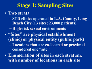 | We will sample all 13 from STD clinic stratum and 23 sites from physical entities using probability-proportional-to-estimated size (PPES) sample |