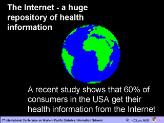 In recent years, the Internet has been making profound impacts on all fields of human activities. It is now widely recognized as one of the most important tools for information. A recent study showed that 60% of consumers in the USA obtain their health information on the Internet. This astounding finding has important strategic and business implications in the delivery of health and healthcares services. |