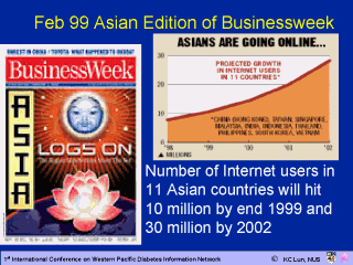 The pervasiveness of the Internet is now spilling over to Asia where some of the world’s largest populations are concentrated. A study reported in the Feb 1999 Asian edition of Businessweek reported that by the end of 1999, there will be some 10 million Internet users in the 11 Asian countries surveyed. This number is expected to increase to 30 million by 2002. |