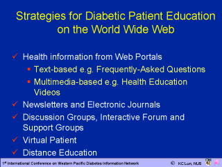 With the many World Wide Web tools now available, and, given the multimedia capability of this new information paradigm, there is now an array of strategies that can be implemented for health education on the Web. This presentation will focus on Web strategies for Diabetes Patient Education. |