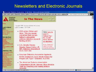 Web users can now access literally hundreds of medical newsletters and e-journals on the Internet. The American Diabetes Association (ADA) has a daily electronic web-baed newsletter, the ADA News Daily, on diabetes news and education. |