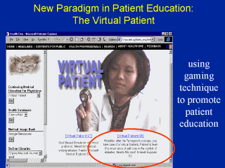 In 1998, Health ONE introduced the concept of virtual patient for the education of patients with Type I diabetes. The virtual patient helps diabetic patients to learn about the management of the disease through game-playing. |