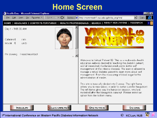 This is the Home Page of the Virtual Patient displaying (a) the patient’s current health status, (b) his current caloric intake for the day, (c) number of units of insulin administered, (d) current blood sugar level and (e) his current score based on adherence to dietary limitation and strict adherence to his insulin regime. |