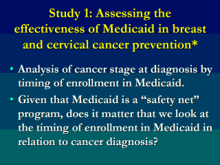 | * Koroukian SM. Assessing the effectiveness of Medicaid in breast and cervical cancer prevention. Journal of Public Health Management and Practice, 2003; 9(4): 306-314. |