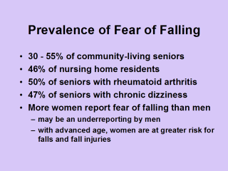 prevalence of the fear is among women and previous fallers. Although many other populations haven’t been studied, this fear may be more prevalent among seniors who are at increased risk of falling. |
