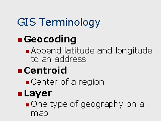 | GIS Terms and Their Meanings: Geocoding The process of determining the coordinates of a specific location based on its street address or its existence within a known region. Coordinates can be assigned as a pair of XY coordinates or a latitude and longitude. Centroid The coordinates representing the center of a region. Generally there are two types of centroids: Geographic Centroid Represents the geometric center of the region. In the case of a circle or a square, the centroid will always be equidistant from the sides. Population Centroid Represents the point inside of a region containing the greatest population density. Layer Layers in a GIS system can be thought of as transparent overlays over the map, each containing a different type of geography. For example, typical layers in a map could include: highways, census tracts, patient locations, county boundaries, etc. By keeping them in separate layers, the lines and symbols used to depict the geographical features can be applied by layer to differentiate by color or line style, for example, census tract boundaries can be distinguished from zip code boundaries by using a different dotted versus solid lines. |