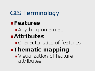 features are specific places on a map. Features can be addresses, roads, regions, etc. Attributes Attributes are literally database fields that describe geographic features. Each layer in a GIS can be thought of as table in a relational database. Attributes represent a database table which is linked to a geographic layer. Each record in the table corresponds to a geographic feature in the layer and its fields Thematic mapping Also sometimes called "theme mapping", it is a data visualization technique where the attributes of geographic features are displayed graphically on a map. For example, a map showing census tracts which are color coded on the basis of the number of households residing in each tract. Thematic maps can also be applied to point locations, such as a map showing hospital locations where the size, color, and symbol indicate the type of hospital and the number of beds. |