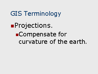 The significance to projection methods is that GIS users must be aware of the method(s) associated with geocoded datasets and geography files so that layers using different projections are not mixed on the same map. Most GIS software will automatically distinguish between layers using different methods and warn the user that the methods are inconsistent. Geocoded datasets, however, can be more problematic since they may not carry the projection method used to assign the coordinates, leaving the user to keep track of the method and ensure that it matches the projections of other datasets and geographic layers. |