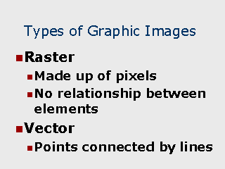 | Raster Graphics Typically are used to display photos. In a GIS database, raster images may be used to display a satellite or arial photo together with geographic features. This provides the ability to view natural boundaries and features which may not have been digitized. Vector Graphics A series of digitized points which have been joined together by lines. Geographic features in a GIS are typically in a vector format. Regioins are simply a series of points joined together to form a bounded polygon. |