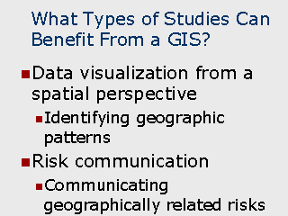 | Data visualization Data visualization is often useful in identifying patterns and relationships when data are displayed from a geographic perspective. For example, a tabular report showing mortality rates of census block groups can be useful in identifying which specific block group have relatively high or low rates. When the block groups are depicted in a thematic map, however, sets of contiguous block groups with unusually high rates can be readily identified as being within close proximity to each other. In another example, clusters of point can be readily identified by viewing them on a map, whereas a simple report listing would not reveal their proximity to one another. Risk