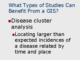 Clusters: A larger than expected number of incidences of a disease related by time and place