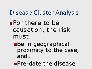 disease truly exists. This can be illustrated by viewing a typical map containing disease cases indicated as points on the map. Visually identifying clusters may not always be meaningful if the cases are not also related by time. The time element is important for two reasons: If there is a source of transmission for the disease, exposure to the source must pre-date the disease. In the case of infectious disease spread by person-to-person contact,, the incidence of the cases must be related to each other. As an example, identifying a group of 50 cases within a relatively small area over a period of 10 years is not as meaningful as 50 cases over 6 months. Another way to look at it is that for a number of disease cases to be spatially related, everyone living the in geographical region in which the cluster is located will be at an elevated risk for the disease. Testing for both a spatial/temporal relationship can be done statistically. Software also exists to perform cluster analysis (Satscan, 1999) "SaTScan uses either a Poisson based model, where the number of events in an area is Poisson distributed under the null hypothesis, or a Bernoulli model, with 0/1 event data such as cases and controls. The program adjusts for the underlying homogeneity of a background population. With the Poisson model it can also adjust for any number of categorical covariates provided by the user." Recommended Readings |