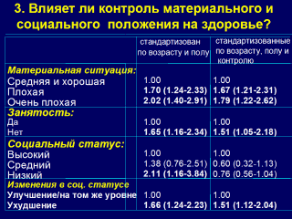 оказалось истиной. (данные не приведены). Затем мы исследовали, отражается ли контроль на влиянии материального и социального статуса (следили за результатами добавления контроля). Можно видеть, что основное изменение в odds ratio для социальной позиции (падают с 2.11 до 0.76 ) происходит для низкого социального статуса. Отсюда предположение, что негативное влияние низкого социального статуса на здоровье опосредовано через низкий уровень контроля. Тем не менее, контроль не объясняет влияние плохой экономической ситуации на здоровье. |